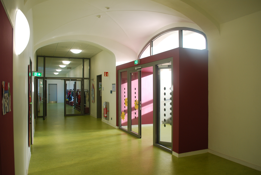 Die Gewölbedecken in den Fluren konnten durch die speziell entwickelten Brandschutzdurchgänge vor baulichen Eingriffen bewahrt werden.