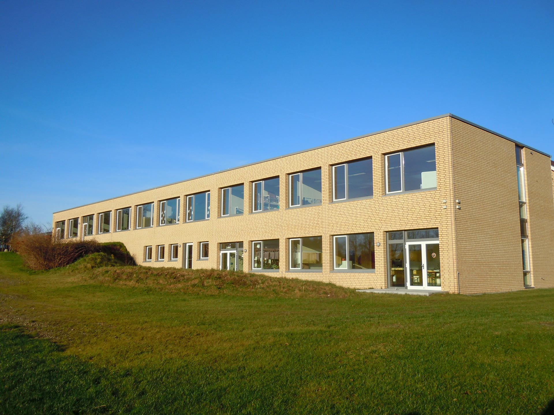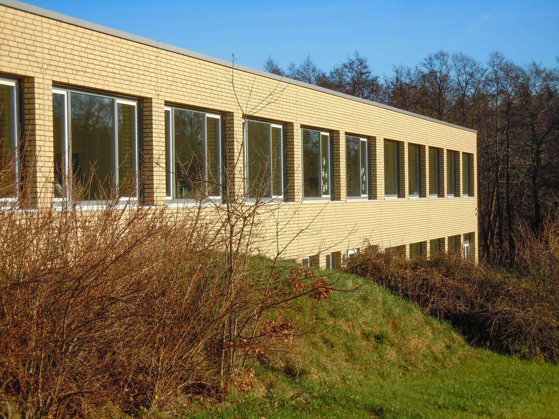 Die bauliche Grundanlage erfuhr mit der Erweiterung des 2-geschossigen Klassenriegels eine besondere Prägnanz im Landschaftsraum des Treenetals.