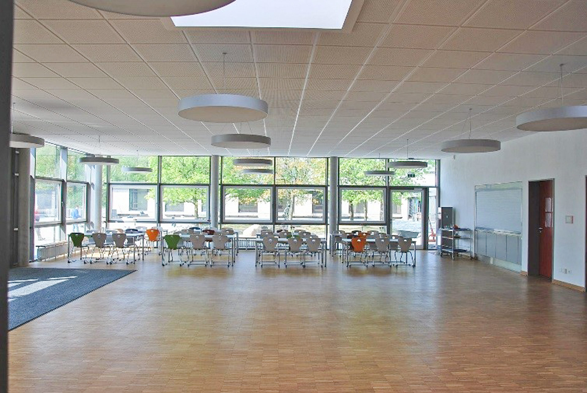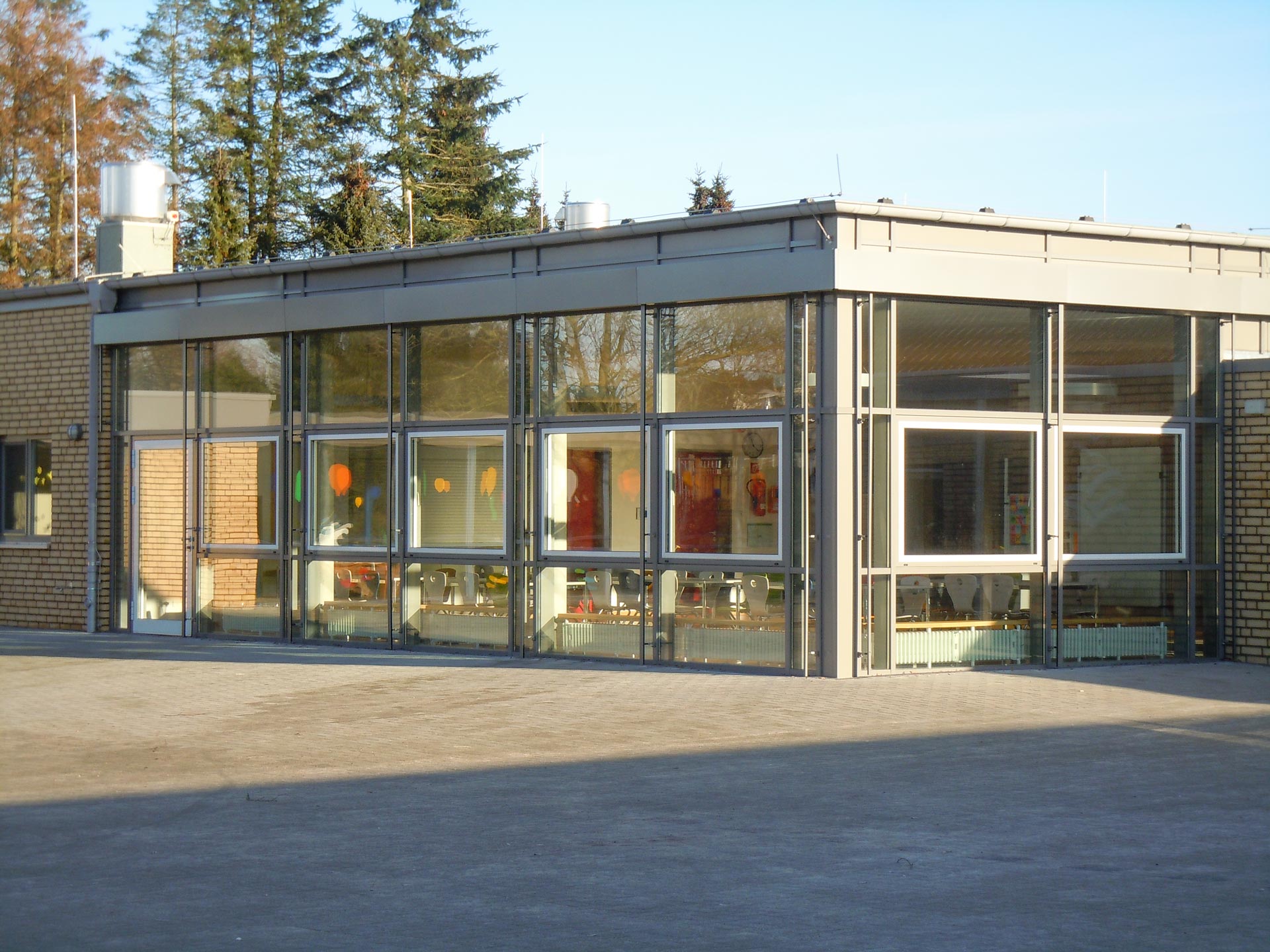 Die bestehende Grundschule wurde um einen Trakt für Klassen und Fachklassen erweitert. An Stelle der alten Eingangshalle wurde eine neue Eingangs- und Pausenhalle in Verbindung mit einer Mensa mit Verteilerküche errichtet.