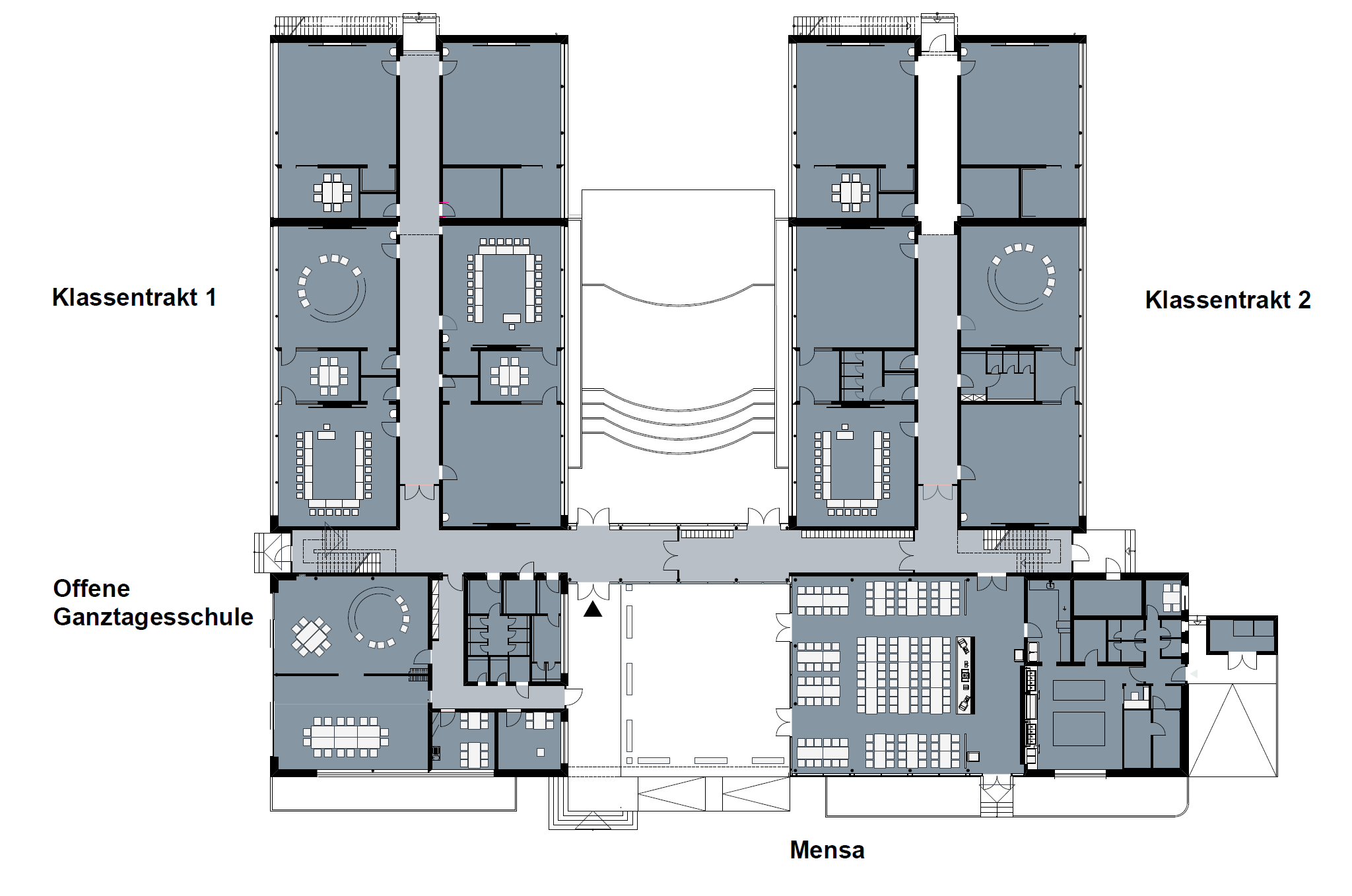 Der Neubau schließt den Pausenhof nach Norden ab. Von der zentralen inneren Erschließungsachse orientieren sich Mensa und Ganztagesschule nach Süden und umgrenzen den zentralen Eingangshof, der auch als Außenterrasse der Mensa dient. Zwei Klassentrakte nördlich der Erschließungsachse umgrenzen den Hof für die Freilichtbühne.
